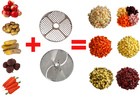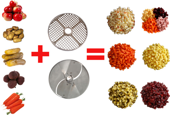 Комплект дисков для нарезки кубиками (нож+решетка) используется для нарезки сырых плотных овощей (картофель, морковь, свекла, редис, огурцы в т.ч. маринованные) для рагу и начинки мучных изделий вместе с рубленым мясом и луком, а также для нарезания болгарского перца и моркови для риса с овощами.