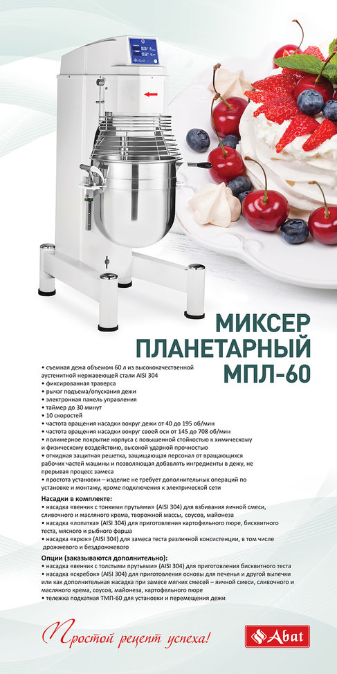 Миксер планетарный МПЛ-60 предназначен для использования на предприятиях общественного питания для смешивания различных пищевых продуктов (муки, воды, молока, яиц, соли и др.) и получения жидких или мягких смесей, готовых или на промежуточной стадии обработки, предназначенных для кондитерского производства и/или выпечки хлебобулочных изделий.