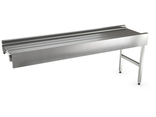 Промежуточная секция представляет собой неотъемлемую часть транспортера, предназначенную для увеличения его длины. Промежуточная секция выпускается двух размеров – длиной 1 м и длиной 2 м. Необходимая длина транспортёра определяется заказчиком и достигается набором промежуточных секций. Каркас транспортёра выполнен из оцинкованной стали, облицовка – из нержавеющей. Применение этих материалов позволяет эксплуатировать транспортёр в помещениях с повышенной влажностью воздуха. Регулируемые ножки каркаса позволяют компенсировать неровности пола при установке оборудования. В изделии применена конвейерная лента, состоящая из тканевого основания, верхнего слоя из ПВХ и одной тканевой прокладки. Ширина ленты транспортёра 450 мм, толщина 2,5 мм. Использование ПВХ ленты позволяет уменьшить до минимума звук работы транспортёра и обеспечивает простоту промывки изделия.