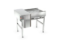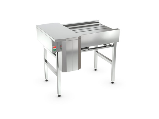 Рабочая поверхность модуля выполнена из нержавеющей стали AISI 430. Каркас выполнен из нержавеющей (AISI 304) трубы сечением 40х40мм. Опорные ножки с пластиковой нижней частью регулируются по высоте в пределах 20 мм. Модуль является неотъемлемой частью транспортера, предназначен для осуществления движения ленты. Модуль оснащен очистителем для удаления прилипшей грязи и поддоном для ее сбора. В качестве привода применен мотор-редуктор мощностью 0,37 кВт. Напряжение сети: 3 фазы, 380 В, 50 Гц. Скорость движения ленты – 20 см/с. Максимальная нагрузка на ленту – 15 кг/пог.м. Ширина ленты – 450 мм.