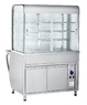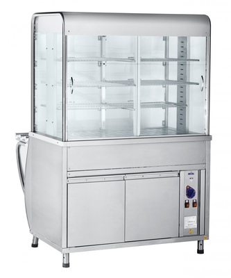 Прилавок-витрина тепловая ABAT ПВТ-70М предназначен для кратковременного хранения в теплом состоянии мелкоштучных хлебобулочных и кондитерских изделий и пищевых продуктов на тарелках, функциональных емкостях, подносах, а также раздачи их потребителю. Внутренний объем витрины обогревается теплым воздушным потоком, поступающим из ванны, воздух в которой нагревается ТЭНами. Для равномерного распределения температуры воздуха в витрине прилавка установлен вентилятор. Внизу закрытый нейтральный шкаф для кухонного инвентаря. Витрина оборудована лампами подсветки, имеет регулируемые по высоте ножки.