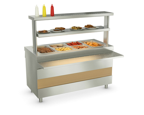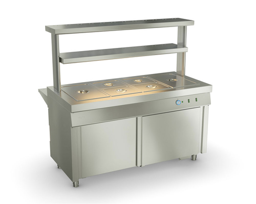 Под каждой гастроемкостью расположен электронагреватель, который поддерживает в горячем виде вторые блюда.