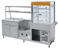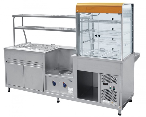 Сочетает в себе сразу 3 прилавка: холодильную витрину, мармит первых блюд и мармит вторых блюд. Регулировка холодильной витрины от +5 до +15°С. Внутренний объем витрины имеет принудительную циркуляцию охлажденного воздуха и лампу подсветки. Три полки-решетки. Охлаждаемая ванна с 2-мя гастроемкостями GN 1/1. Мармит первых блюд - одна конфорка. Регулировка мощности конфорки-3-х позиционным пакетным переключателем. Мармит вторых блюд имеет плавную регулировку температуры от +30 до +85°С. Способ обогрева гастроёмкостей – горячим паром, в качестве нагревательных элементов применяются 2-а ПЭНа, расположенных под ванной. Внизу - нейтральный шкаф для хранения кухонного инвентаря. Двойная полка над мармитом обеспечивает большую полезную площадь для выкладки блюд и имеет лампу подсветки. Гастроёмкости и направляющие для подносов входят в комплект поставки. Прилавок имеет регулируемые по высоте ножки.