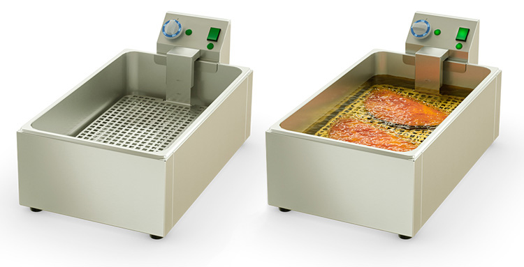Трубчатый электронагреватель (ТЭН) защищен решеткой от налипания на него теста. Фритюрная ванна «Чебуречница Евро» комплектуется блоком управления с ТЭНом мощностью 3,9 кВт. Трубчатый электронагреватель (ТЭН) защищен решеткой от налипания на него теста. Все корпусные детали фритюрной ванны, включая ТЭН, изготовлены из нержавеющей стали.