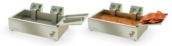 Чебуречница выполнена из нержавеющей стали. Фритюрная ванна представляет собой нержавеющую сварную емкость с краном для слива масла. Справа на ванне установлен поддон для выкладки готовых изделий. Поддон имеет специальные отверстия, благодаря которым излишний фритюр с продукта стекает обратно во фритюрную ванну. Блок управления включает в себя электротерморегулятор и трубчатый электронагреватель (ТЭН), выполненный из пищевой нержавеющей стали. Терморегулятор способен поддерживать температуру фритюра в диапазоне от +50 до +190°C. Объем ванны – 25 л, объем фритюра max – 14 л. В комплекте поставляется кулинарный пинцет