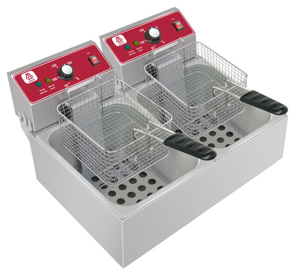 Электрофритюрницы предназначены для приготовления во фритюре различных продуктов питания: мяса, рыбы, овощей, мучных изделий при температуре фритюра 190°С. Электрофритюрница выпускается с гастроемкостями GN 1/2. Состоит из корпуса, двух гастроемкостей, двух блоков управления нагревом, двух фритюрных сеток для загрузки продуктов в ванну и двух лопаток для перемешивания продуктов. Нагрев фритюра осуществляется ТЭНом. Все корпусные детали электрофритюрницы, включая ТЭН, изготовлены из пищевой нержавеющей стали.
