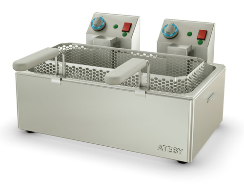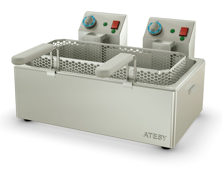 Фритюрница выполнена из нержавеющей стали. Фритюрная ванна представляет собой цельнотянутую нержавеющую гастроемкость GN1/1 глубиной 150мм. Блок управления включает в себя электротерморегулятор и трубчатый электронагреватель (ТЭН), выполненный из пищевой нержавеющей стали. Терморегулятор способен поддерживать температуру фритюра в диапазоне от +50°C до +190 °C. Объем фритюра max – 10 л. Садок имеет удобную пластмассовую ручку, которая предотвращает его выскальзывание из рук во время работы. Крышка в комплекте.