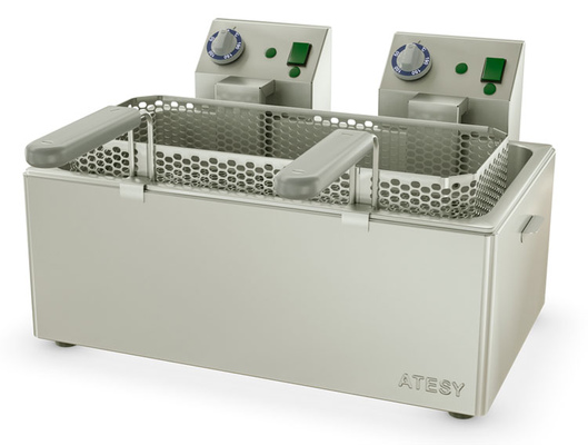 Фритюрница выполнена из нержавеющей стали. Фритюрная ванна представляет собой цельнотянутую нержавеющую гастроемкость GN 1/1. Блок управления включает в себя электротерморегулятор и трубчатый электронагреватель (ТЭН), выполненный из пищевой нержавеющей стали. Терморегулятор способен поддерживать температуру фритюра в диапазоне от +50 до +190 °C. Объем ванны – 26л, объем фритюра max-15 л. Садок имеет удобную пластмассовую ручку, которая предотвращает его выскальзывание из рук во время работы.