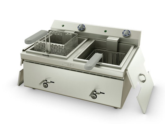 Конструкция сборная, выполнена из пищевой нержавеющей стали. Столешница толщиной 50 мм. В столешницу вварены две ванны 265х320х190 мм, в каждой из которых расположено по одному ТЭНу мощностью 3 кВт. Объем каждой ванны –16 л, объем используемого фритюра в каждой ванне – 9 л. Для регулировки температуры нагрева масла предусмотрены независимые терморегуляторы для каждого ТЭНа. Садки прямоугольной формы выполнены из пищевой нержавеющей стали. Для удобства очистки ванн в каждой предусмотрено по одному крану для слива масла.