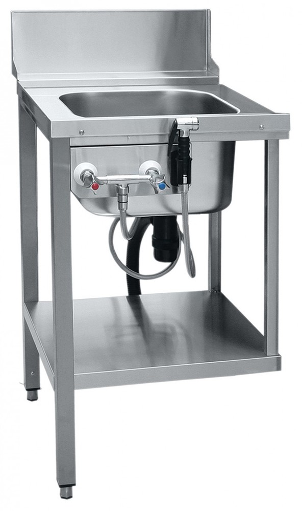 Стол предмоечный СПМП-6-1 имеет цельнотянутую ванну для предварительного ополаскивания посуды (400х400х250 мм),душирующее устройство для холодной и горячей воды, регулируемые по высоте ножки. Путем несложного монтажа стол можно установить как в левом, так и правом исполнении. Используется с купольными машинами серии МПК.