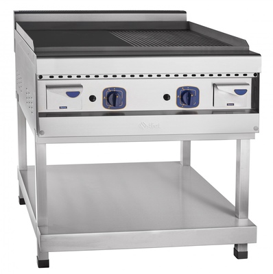 Работает как на природном, так и на сжиженном газе. Жарочная поверхность 834х703 мм имеет одну половину с гладкой поверхностью, другую с рифленой. Двухступенчатая регулировка мощности нагрева жарочной поверхности. На лицевой панели расположены лотки для сбора масла. В комплекте съемные форсунки под сжиженный газ. Пьезорозжиг.