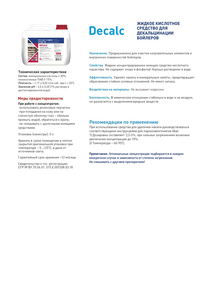 Жидкое кислотное средство Decalc предназначено для очистки нагревательных элементов и внутренних поверхностей бойлеров.