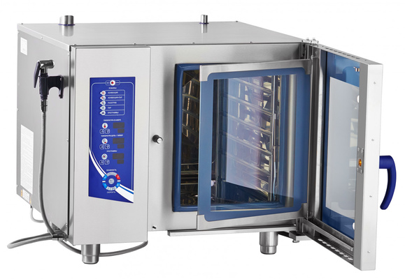 Удобная панель управления на русском языке. Вентилируемая дверь духовки предотвращает риск получения ожога рук с внешней стороны дверки. Механизм замка дверки действует по принципу "свободные руки" - дверку можно закрывать одним движением руки. Двухходовой механизм открывания дверки духовки обеспечивает безопасность персонала от воздействия горячего пара. Автоматика обеспечивает быстрый выход пароконвектомата на рабочий режим. Низкое энергопотребление (по сравнению с аналогами) снижает эксплуатационные расходы на приготовление блюд. Жировой фильтр легко снимается без дополнительных инструментов. Конструкция духовки позволяет мыть ее изнутри под струей воды. Полуавтоматическая мойка с применением режима "Пар".