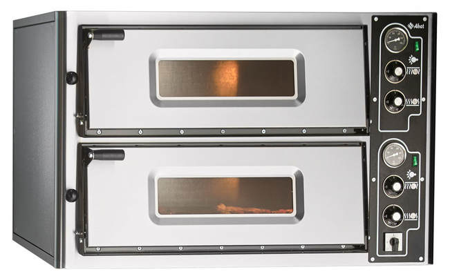 Две камеры. Каждая камера вмещает 4 заготовки для пиццы диаметром 350 мм и имеет раздельную регулировку мощности верхних и нижних ТЭНов. Рабочий диапазон температуры духовки +20...+450 С. Установленный аварийный термовыключатель предохраняет шкаф от перегрева свыше +500 С. Облицовка выполнена из окрашенного металла, дверка и рамка камеры из эмалированного, а жарочный шкаф из оцинкованного листа толщиной 1,5 мм. Поды из жаропрочного камня толщиной 20 мм.