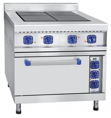 Чугунные конфорки в качестве нагревательных элементов оснащены тремя ТЭНами, что обеспечивает быстрый и равномерный нагрев, а также гарантирует долгий срок эксплуатации конфорок. Семипозиционные пакетные переключатели позволяют производить плавную регулировку мощности конфорок. Площадь конфорок - 0,36 кв.м. Конфорки образуют ровную поверхность, что обеспечивает удобное и легкое перемещение наплитной посуды. Внизу - жарочный шкаф с двумя противнями и одной GN 2/1 размером 525х650 мм, изготовленные из нержавеющего металла. Духовка имеет раздельную регулировку мощности верхнего и нижнего блоков ТЭНов. Рабочий диапазон температуры духовки 20-270 С, установленный аварийный терморегулятор предохраняет шкаф от перегрева 300 С. Плита имеет регулируемые по высоте ножки.