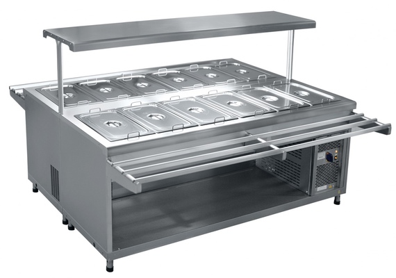 Охлаждаемый салат-бар на 12 гастроемкостей GN 1/1. Одна полка с лампой посветки. Охлаждаемая столешница. 12 гастроемкостей типоразмера GN 1/1 установлены в столешнице в 2 ряда (по шесть гастроемкостей). Изготовлен из нержавеющей стали AISI 304.