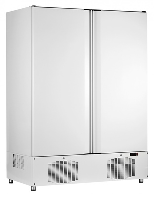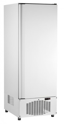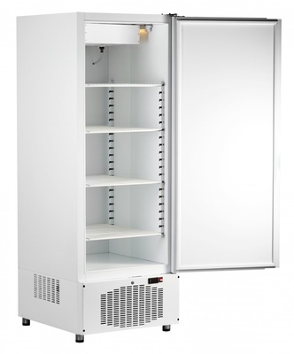 Шкафы холодильные ШХс, ШХ, ШХн объемом 500, 700 и 1500 литров с нижним расположением холодильного агрегата. Цельнозаливной корпус из крашеного оцинкованного листа толщиной 0,55 мм. Герметичный компрессор с электронным блоком управления. На дне шкафа предусмотрено сливное отверстие. Защитная решетка на вентиляторе конденсатора. Ванна выпаривания конденсата. Механический замок. При открывании двери микровыключатель автоматически включает лампу подсветки камеры и выключает вентиляторы воздухоохладителя - во избежание резкого роста температуры в камере шкафа. Шкаф имеет регулируемые по высоте ножки.