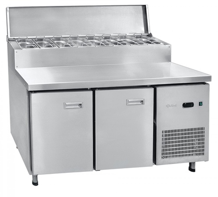 Рабочий диапазон температуры внутри камеры от -2 до +8 С. Температура в верхнем отсеке +5 С. Охлаждаемый рабочий объем составляет 0,3 м3. Эксплуатация стола допускается при температуре от +12 до +42 С с относительной влажностью от 40 до 70%. Имеет две распашные дверки. Комплектуется двумя полками под GN 1/1 и имеет в верхнем отсеке 8 гастроемкостей GN 1/4 - 150 мм под общей откидной крышкой. Все изолирующие стенки и полости стола изготовлены методом заливки пенополиуретаном. Используемый хладагент - R404A. Стол имеет регулируемые по высоте ножки.