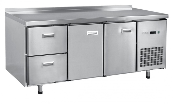 Рабочий диапазон температуры внутри камеры от -2 до +8 С. Охлаждаемый рабочий объем составляет 0,35 м3. Имеет две распашные дверки и два выкатных ящика на телескопических направляющих размером GN 1/1, а также две полки-решетки размером GN 1/1 с возможностью регулировки по высоте. Поверхность стола - не охлаждаемая ровная с бортом. Все изолирующие стенки и полости стола изготовлены методом заливки пенополиуретаном. Используемый хладагент - R404A. Стол имеет регулируемые по высоте ножки.